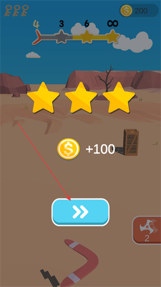 4、成功击中目标,获得三颗星和+100金币奖励,点击蓝色按钮进入下一关。
