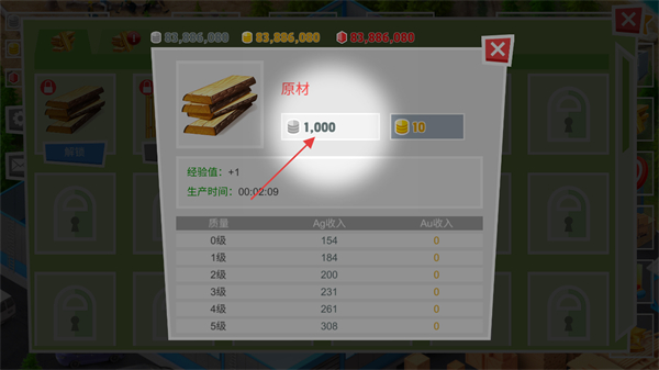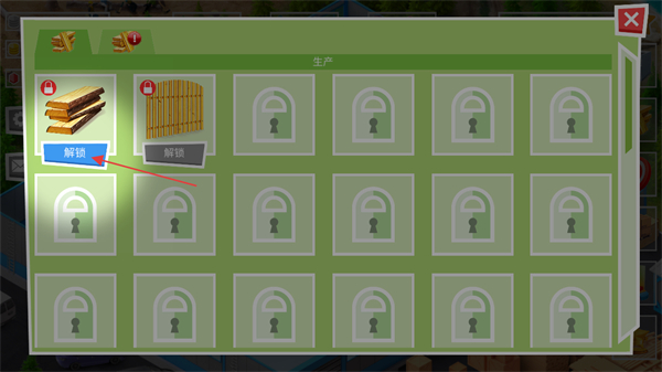 2、在生产界面中,选择想要解锁的产品,如木板,点击解锁按钮。