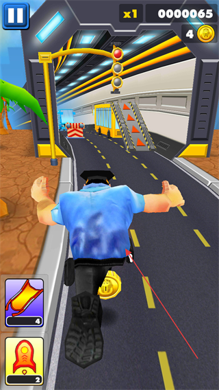 1、进入游戏操控穿蓝制服角色奔跑,留意屏幕左侧道具,收集途中金币,躲避红绿灯及路障。
