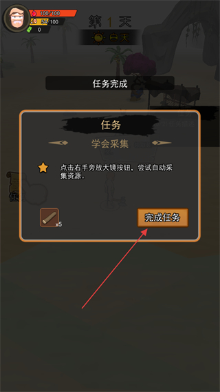4、完成任务后,点击完成任务按钮,领取奖励,如获得木棍,推进游戏进程。