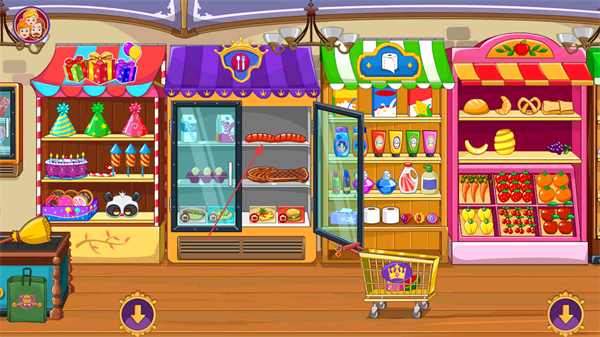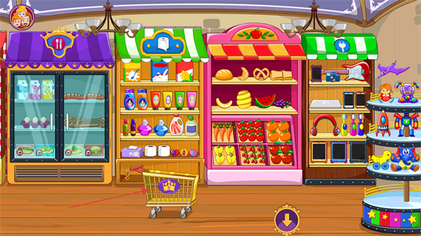 1、进入游戏看到商店场景,点击下方箭头按钮切换货架视角,查看各类商品。