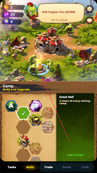 2、点击下方Build选项,按照提示BuildtheGreatHall,解锁并建造GreatHall建筑。