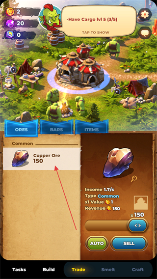 3、点击Trade选项,在交易界面找到CopperOre,按要求完成SellCopperOre0/100的售卖任务。