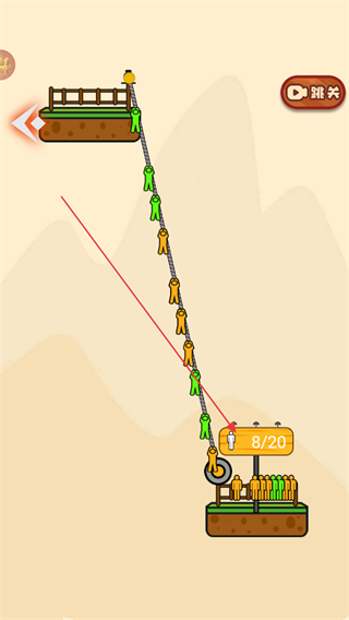 2、控制绳索连接上方平台的小人,让小人能顺着绳索滑落。