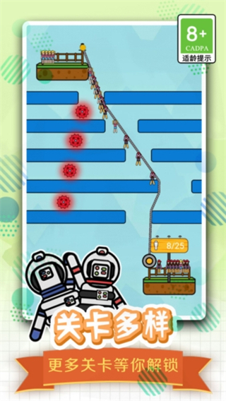 关卡数量丰富,从单绳索直线救援过渡到多绳索拼接、借力机关转向,难度梯度合理,适配不同水平需求。