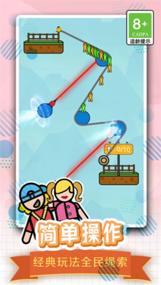 - 全民绳索营救是一款由手指控制的物理解谜休闲益智作品,需要通过绘制绳索解救被困在危险地带的角色,采用独特物理引擎设计,每关都要巧妙规划绳索路线,避