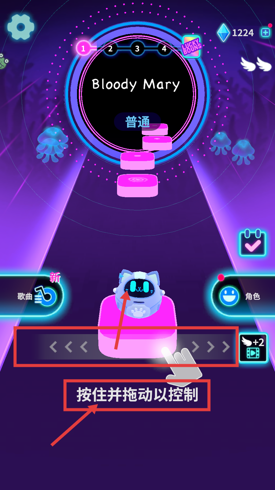 1、选择【BloodyMary】歌曲普通难度,按照提示【按住并拖动以控制】角色,开启音乐闯关之旅。