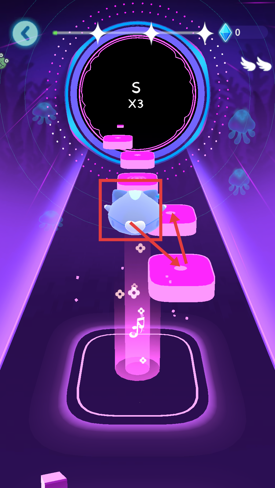 2、挑战过程中操控角色精准落在【粉色方块】上,保持节奏以获取【S×3】评分,推进关卡进程。
