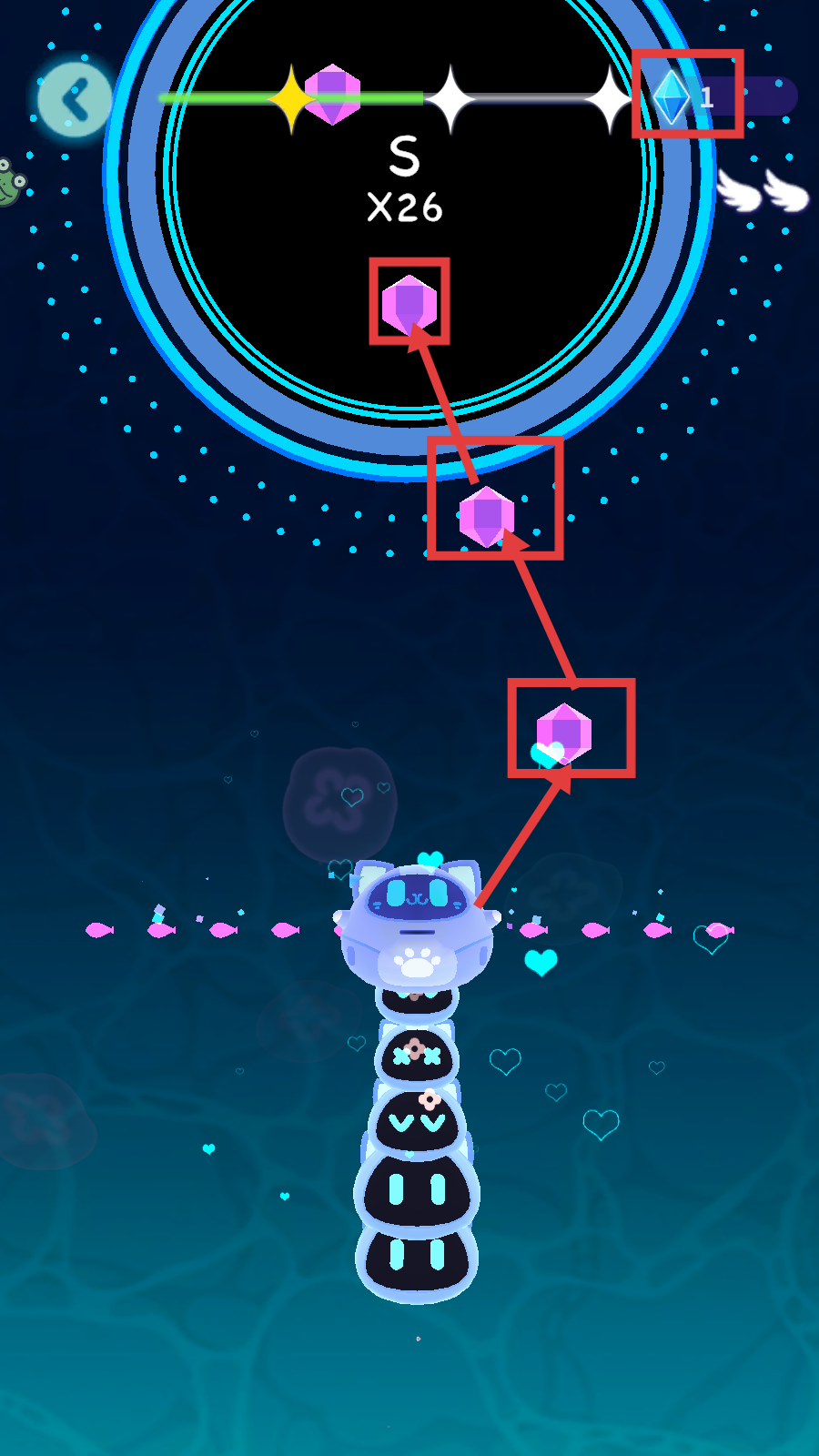 3、闯关时收集【紫色宝石】,可累计获得【钻石-1】并提升评分至【S×26】,增加游戏收益。
