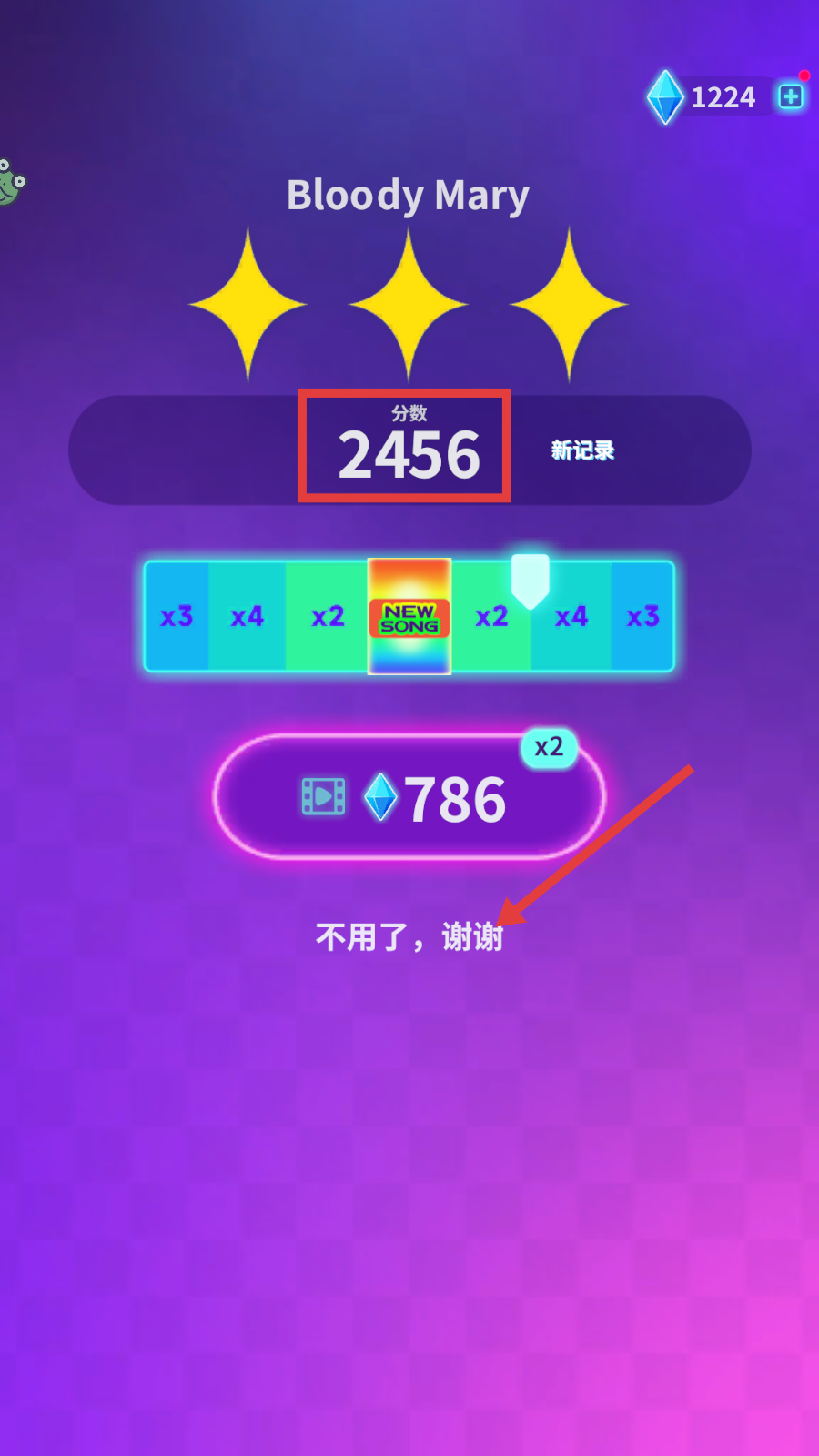 4、通关【BloodyMary】后,获得【分数-2456】新记录,点击【不用了,谢谢】完成结算,可继续挑战其他歌曲。