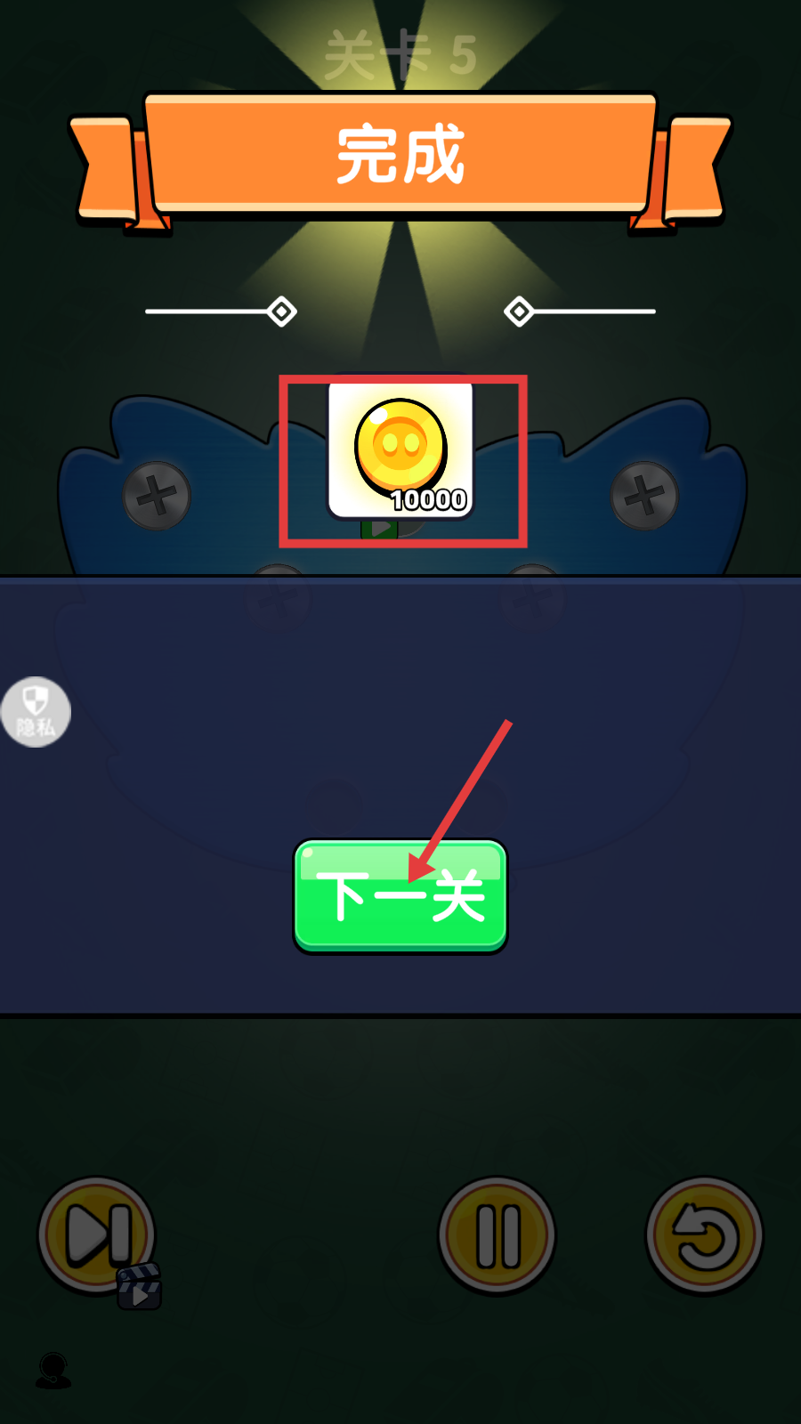 4、完成后获得【10000】金币奖励,点击【下一关】继续挑战,积累金币解锁更多内容。