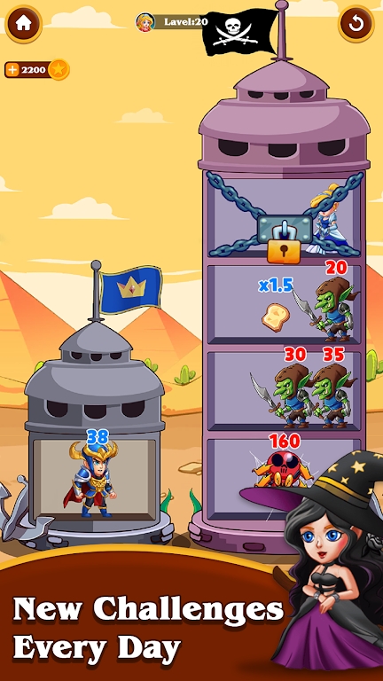 《英雄塔战争》这款游戏里的战斗会很精彩,你要控制自己的角色在关卡里一直挑战,将里面的敌人给消灭。每个塔里都会有不同敌人,它们都是有等级的,同样玩家也是。你要将等级比你低的人给打败,只有这样你才能不断升级,去努力爬塔,将更多敌人给打败。