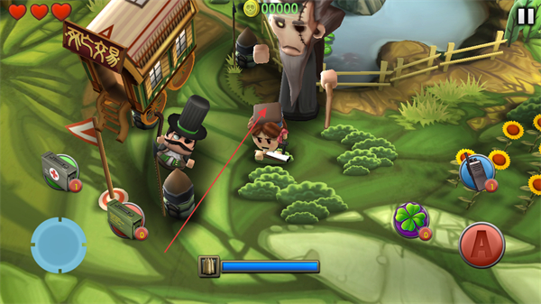 1、进入游戏,留意左上角红心代表生命值,金币数量显示在其旁,操控角色移动攻击僵尸获取金币。