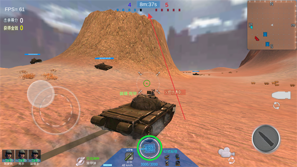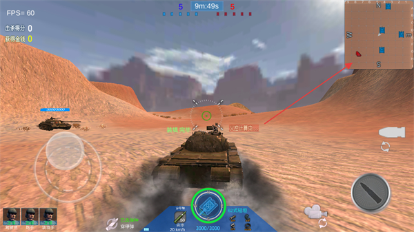 1、进入游戏,通过屏幕右上方小地图了解战场局势和敌方坦克位置。