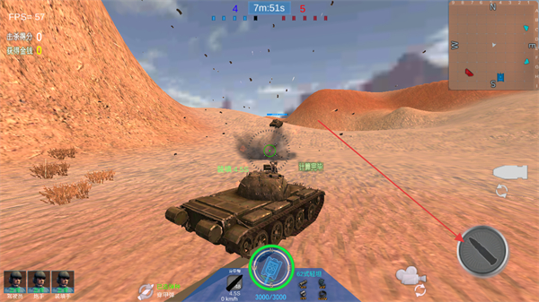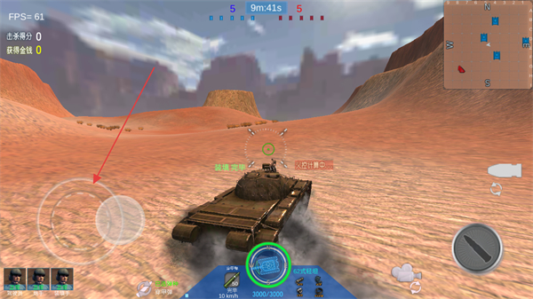 2、利用左下方虚拟摇杆控制自己的坦克移动,调整位置寻找有利地形。