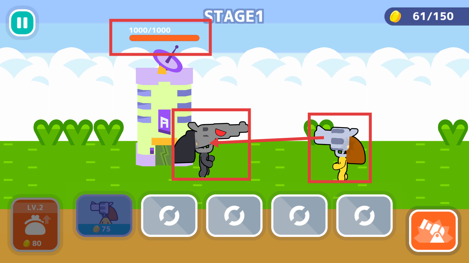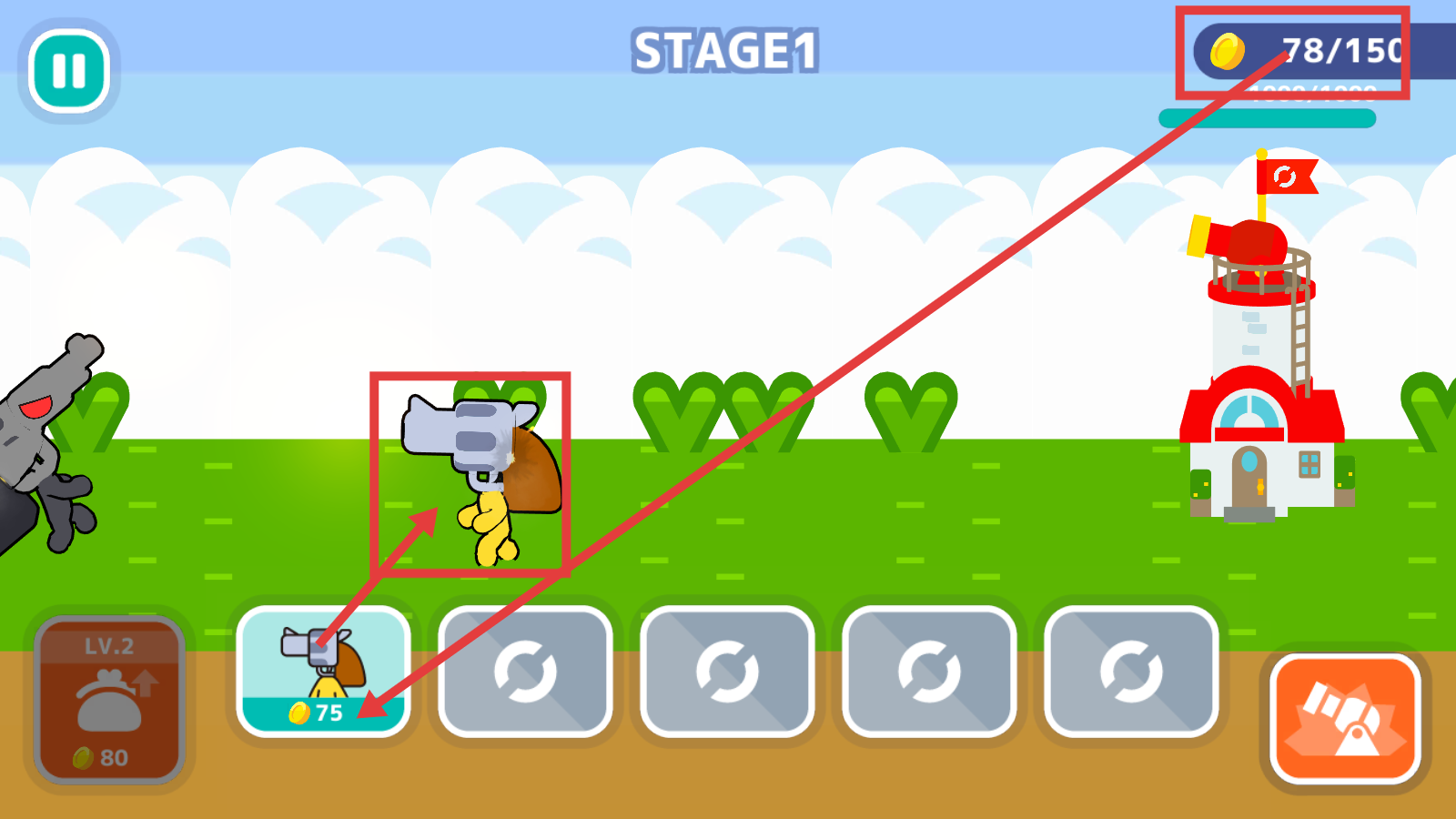 2、在Stage1中操控带枪角色,收集金币(如消耗75金币提升战力),积累资源以增强战斗能力,同时关注金币收集进度(如78/150)。