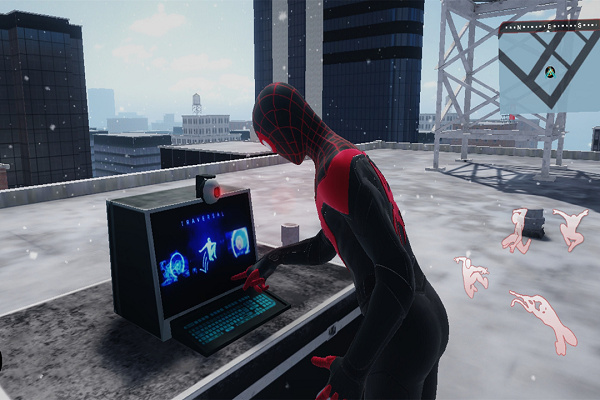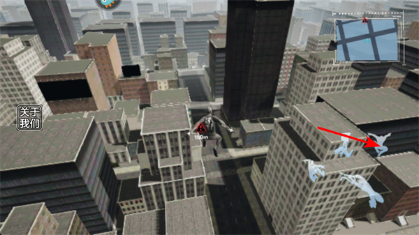 核心亮点在于绳索穿梭玩法,玩家看到场景中的圆点标识时,点击1或2键配合移动键,即可控制英雄在高楼大厦间飞行穿梭,移动过程自由灵活,能快速到达城市各个角落。