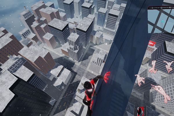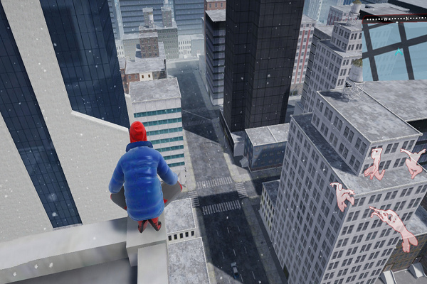 3、在高楼间移动时,点击右侧对应的动作按键,可让蜘蛛侠施展特定的高空移动动作。