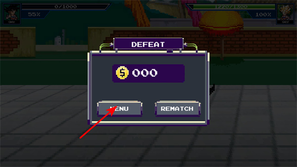 1、战斗失败后,点击MENU按键,可返回游戏主菜单,在能选择重新挑战、更换角色进行设置操作。
