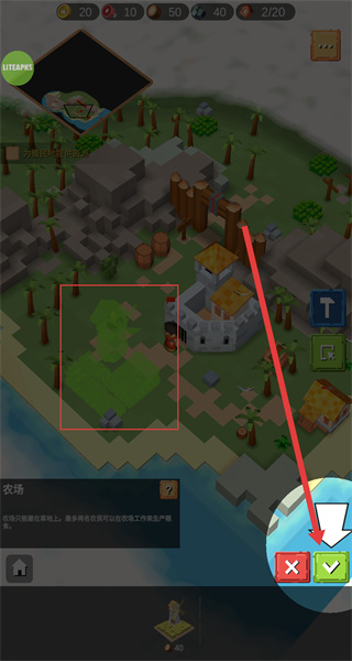 3、将农场拖拽到合适的地皮上后,点击下方打勾按钮即可进行建造。