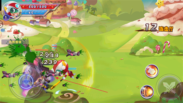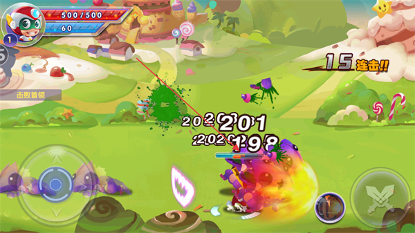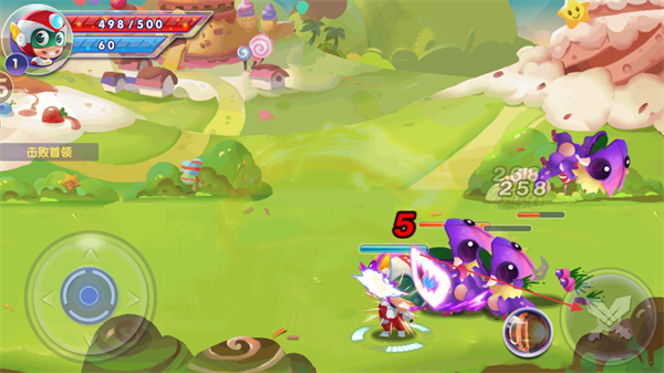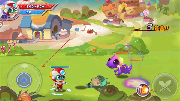 1、进入游戏,留意屏幕左上角角色的生命值500/500与能量值60,通过左下方虚拟摇杆操控开心超人移动。