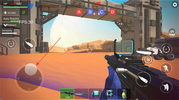 1、进入游戏,通过屏幕左下方虚拟摇杆控制角色移动,熟悉战场环境。