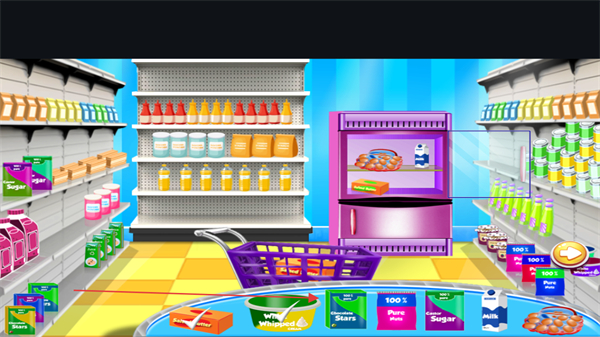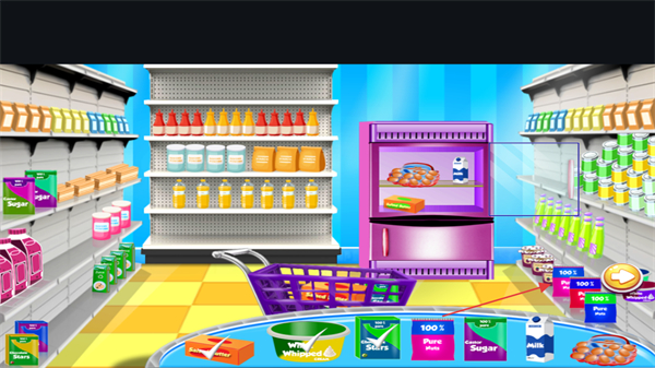 2、在货架和冰柜中寻找所需食材,像面粉、奶油、蔬菜等,持续收集。