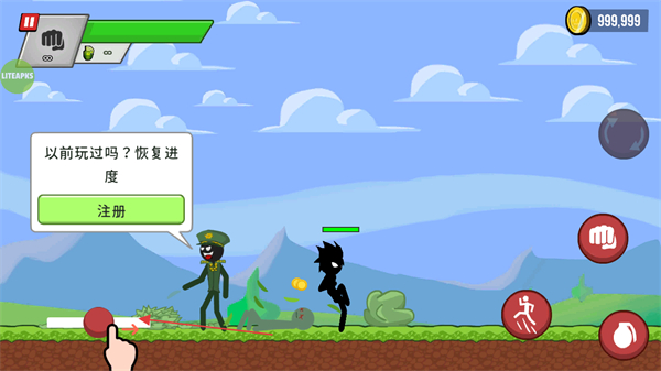 1、进入游戏,若此前玩过,点击注册按钮恢复进度;留意屏幕上方的生命值条和金币数量。