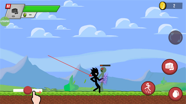2、遇到僵尸敌人时,点击屏幕右侧拳头按钮,操控火柴人攻击僵尸,获取金币。