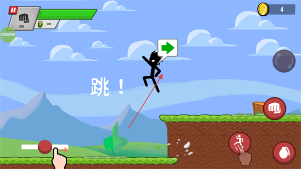 3、前行中遇到地形障碍,点击奔跑按钮助跑,再点跳跃按钮,操控火柴人跳过沟壑。