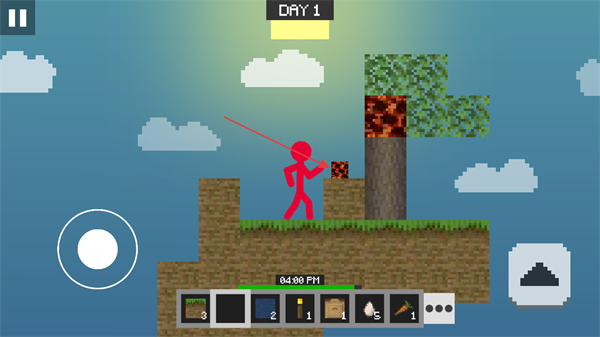 1、操控左侧虚拟摇杆移动火柴人,在空岛中探索树木等资源点。