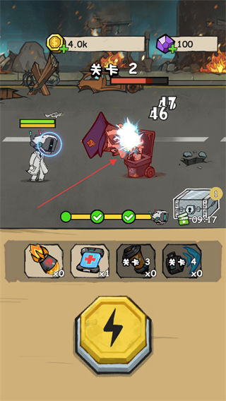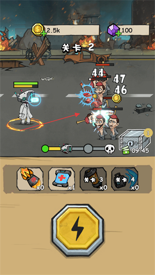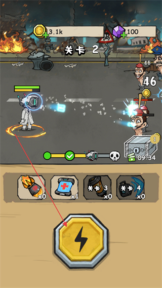 2、点击下方闪电按钮释放技能,快速打击敌人,推进关卡进度。