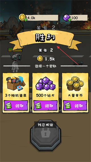 4、通关关卡2后,可选择奖励,获取道具、钻石或金币,助力后续战斗。