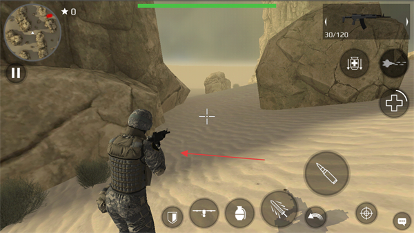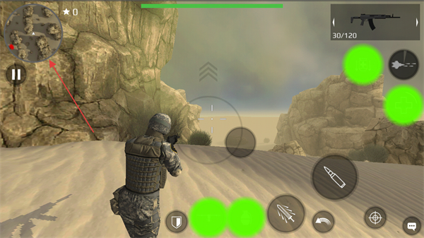 1、观察左上角地图,了解敌人位置,操控角色在沙漠地形中移动,寻找掩体。