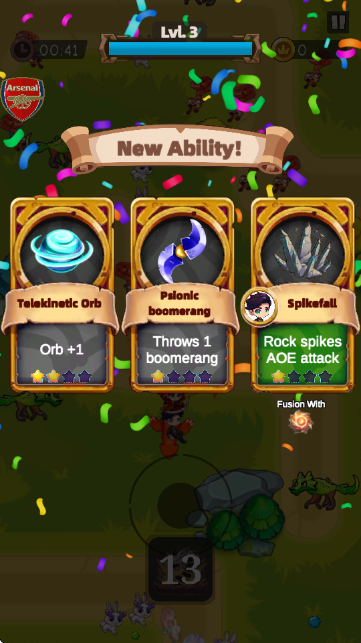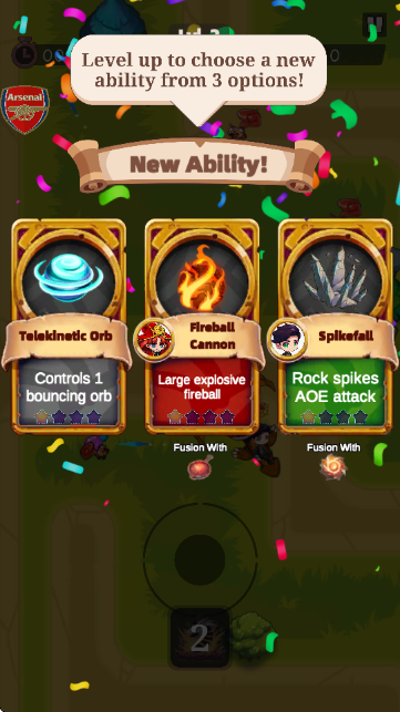 4.升级后会出现三个技能选项(如“念力球”“火球加农炮”“尖刺陨落”),选择其中一个来增强角色能力。