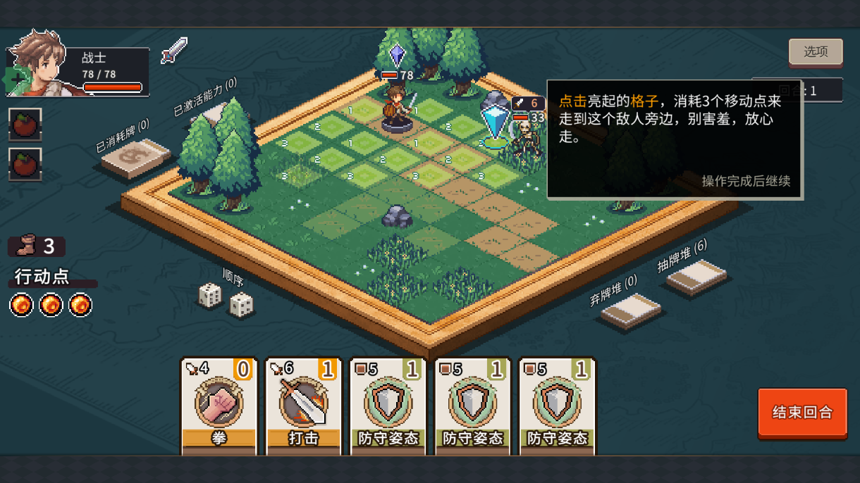 4.两张攻击卡牌可对敌人造成伤害,两张防御卡牌可进行防御。