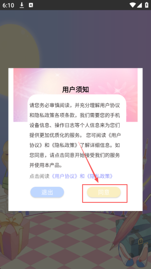 1、首先,阅读用户须知后点击“同意”进入游戏。