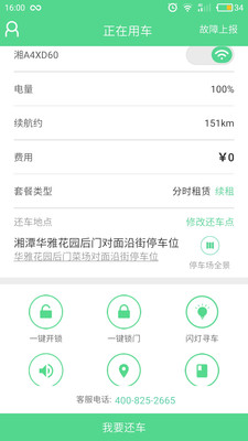 3、用户可使用APP进行车辆的查询、租赁、还车等操作。