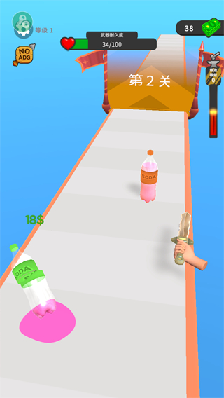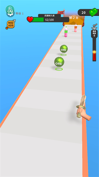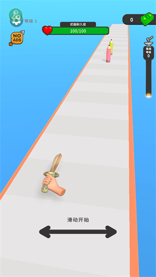 1、在跑道上操控武器如剑,切割彩色铅笔等物体,获取金币奖励。