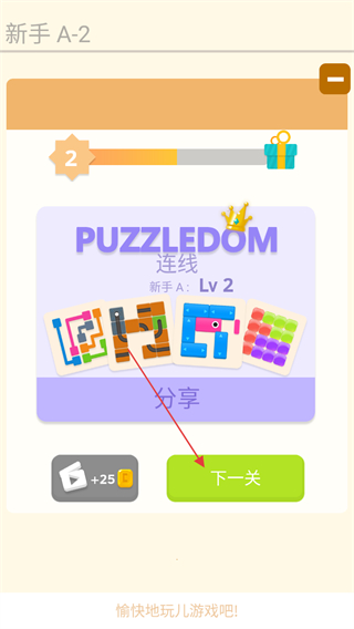 4、通关后可点击下一关继续挑战更复杂的谜题,同时还能通过分享等方式获取奖励。