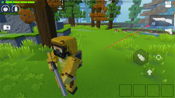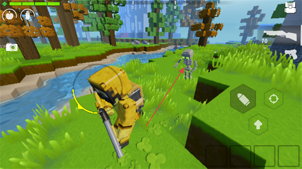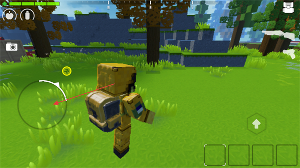 1、操控角色在方块世界移动,左侧摇杆控制方向,探索草地、树林等区域。