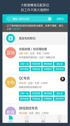 2、运用大数据技术对企业和职位进行刻画,根据用户的学历背景、工作经验、职业性格等因素,精准匹配职位。