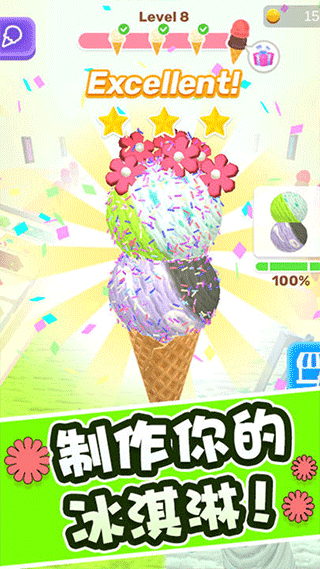 2、场景美丽,需要紧按图示来制作冰淇淋,完成度越高就能得到更高的奖励。给人一种轻松愉悦感觉。
