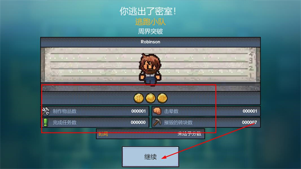 4、成功逃出密室后,会显示逃脱的相关数据,点击继续即可继续游玩。