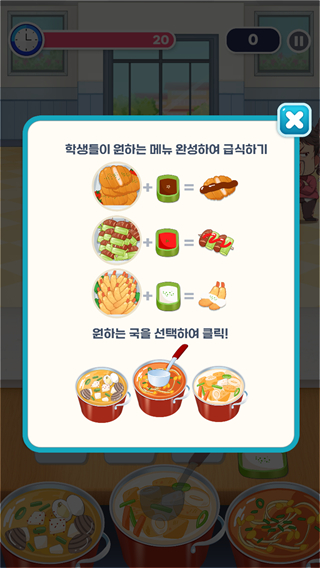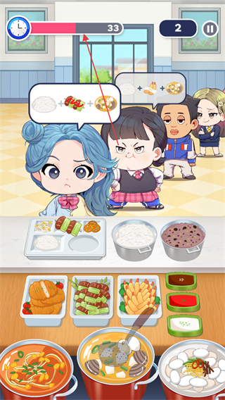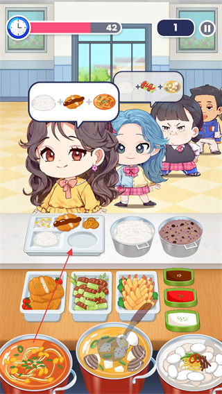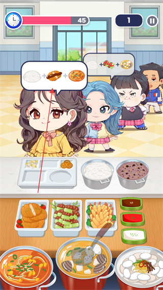 4、根据不同学生的餐食需求,快速选取对应的食材组合,不断完成打饭任务,提升关卡进度和得分。