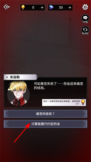 3、在米迦勒契约剧情界面,点击只要能履行约定的话选项,这是强化契约羁绊的关键操作,选择后可推进主线契约剧情发展,界面提示功能能更精准把控剧情走向。