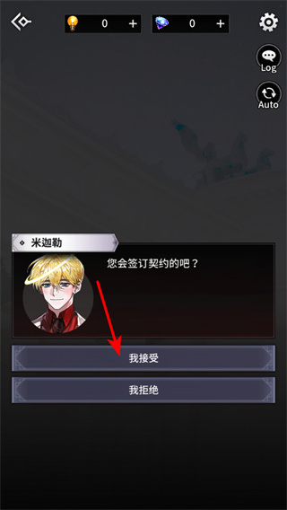 3、进入契约签订界面,点击我接受按钮与米迦勒签订契约,这是解锁角色战力的核心步骤,签订后可获取米迦勒专属技能,构建基础战斗体系。