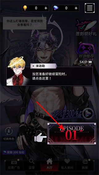 4、完成契约签订后,点击EPISODE01按钮开启第一章剧情,这是推进主线冒险的关键操作,进入章节后将跟随米迦勒引导,解锁更多核心玩法。