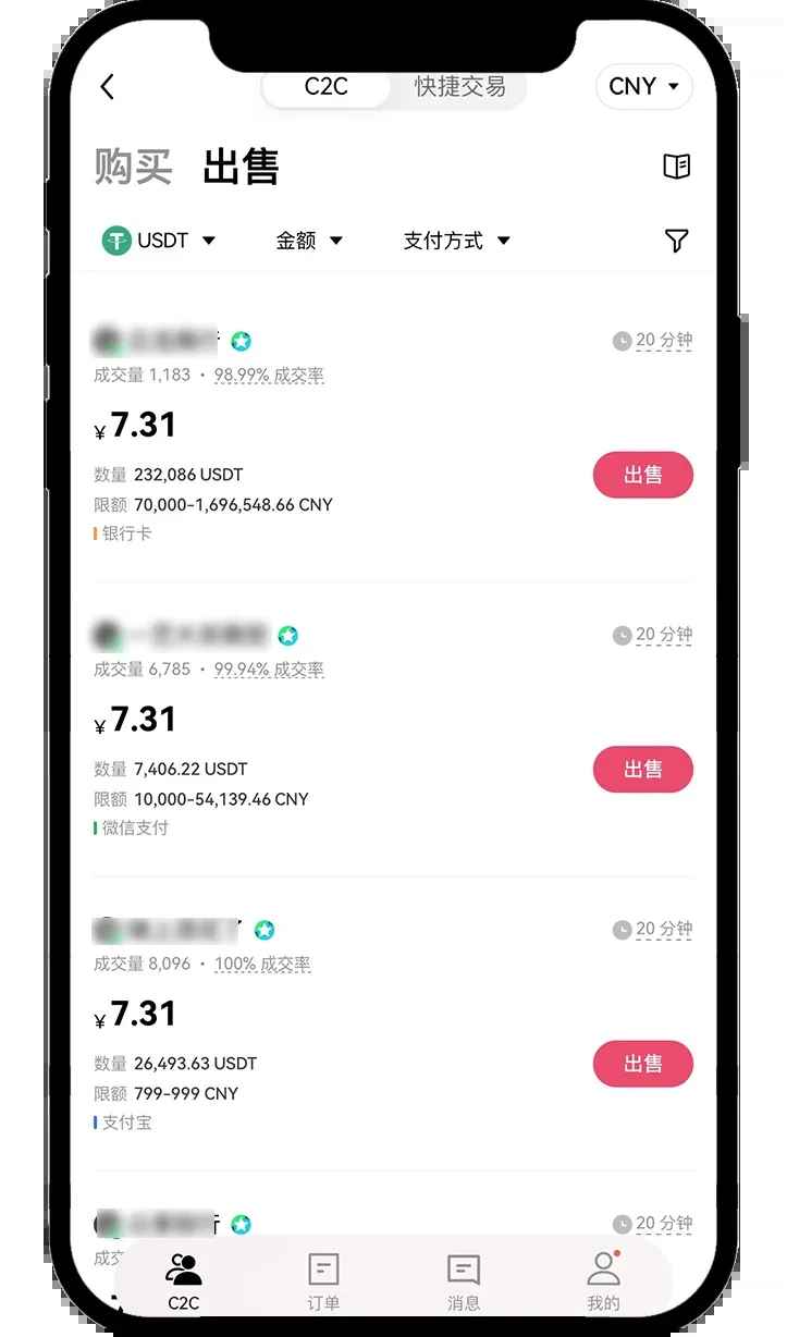 温馨提示:除【快捷买币】区进行卖币之外,您也可以选择【C2C买币】区进行交易—【出售】选择商家,以及合适的价格。如果交易金额≥10万元,也可在【筛选】里选择【大宗交易】。