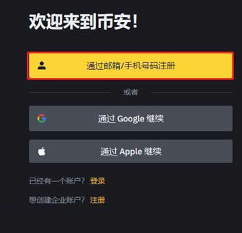 1、打开币安官网,点击左侧的【使用邮箱/手机号注册】